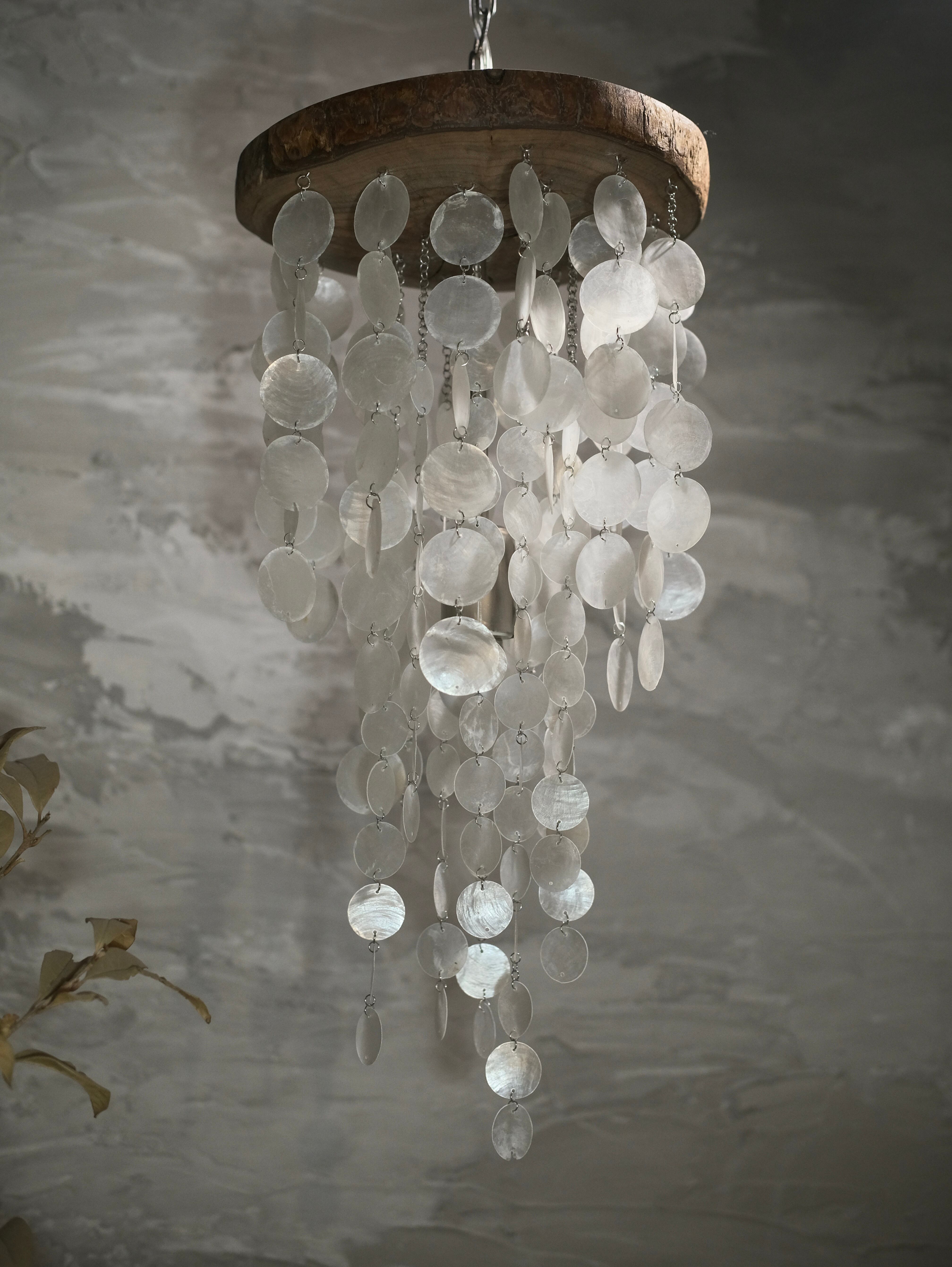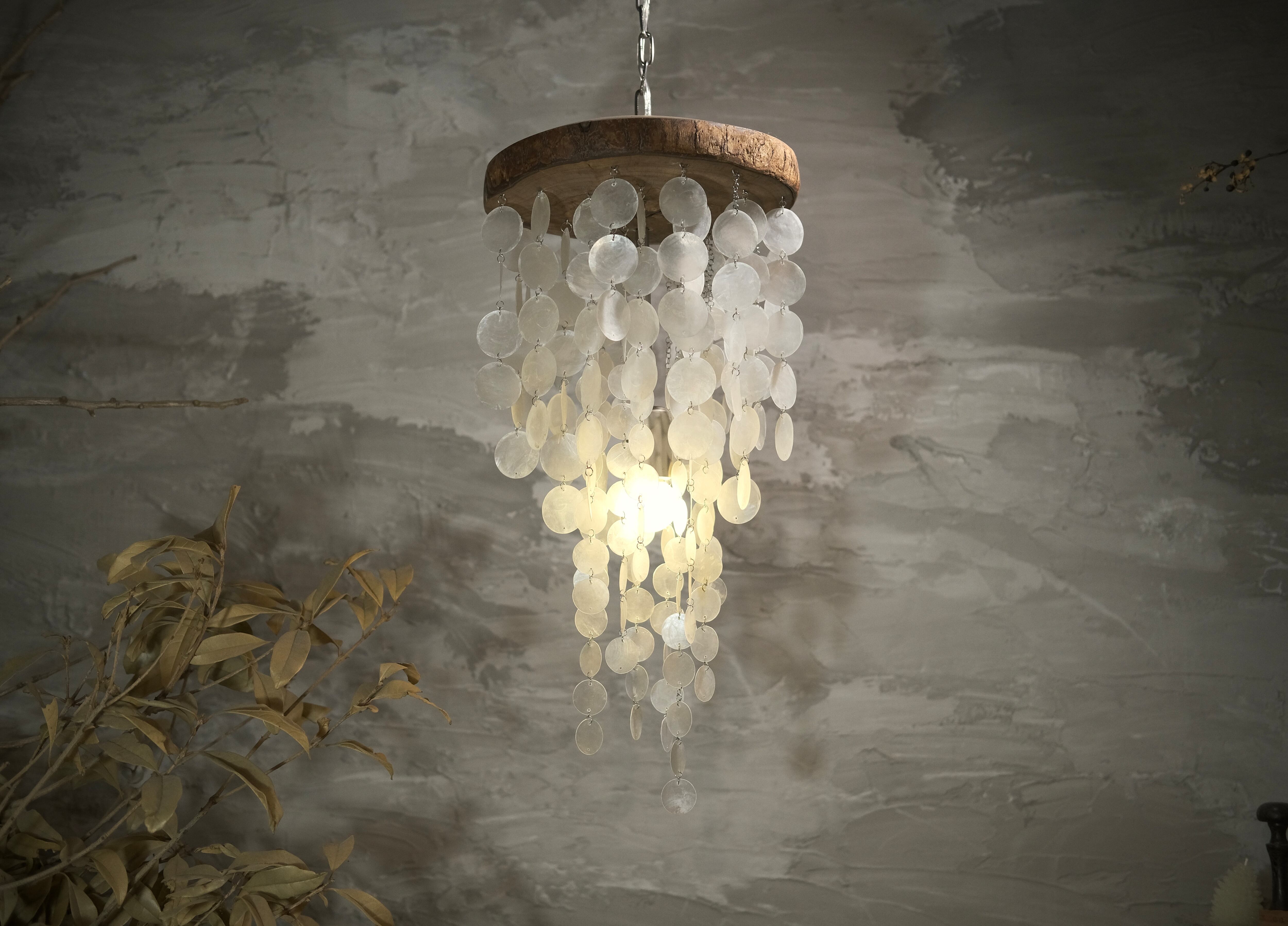 pendant lamp-海月(くらげ)は、楠の原木材とシェルが融合した、優雅で個性的なペンダントライトです。天然の楠が持つ温もりに加え、シェルの美しい輝きが、空間に独特の雰囲気をもたらします。海の中の幻想的な世界を思わせるデザインが、リビングやダイニング、寝室など、さまざまなインテリアに調和し、心地よい光があふれる空間を演出します。