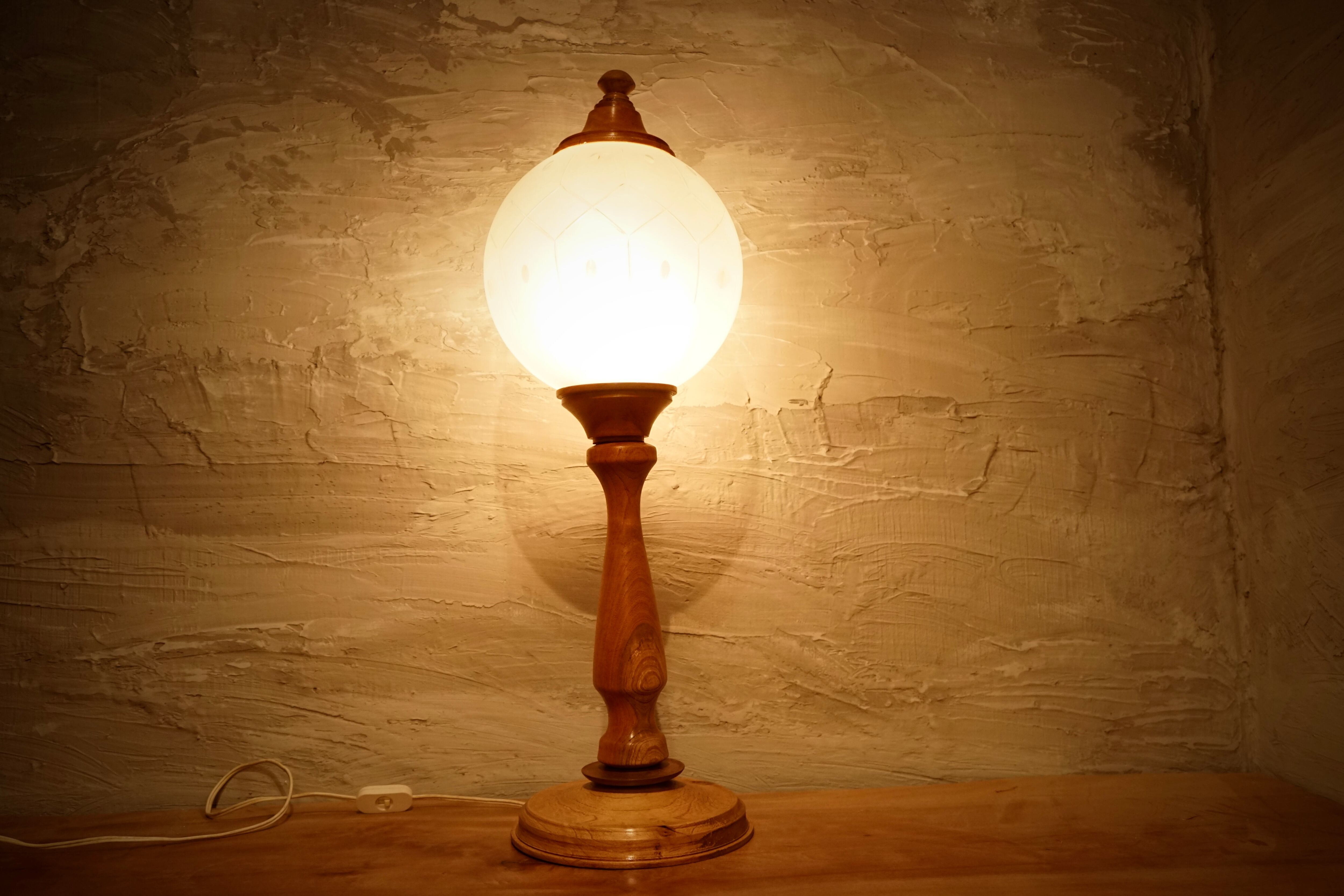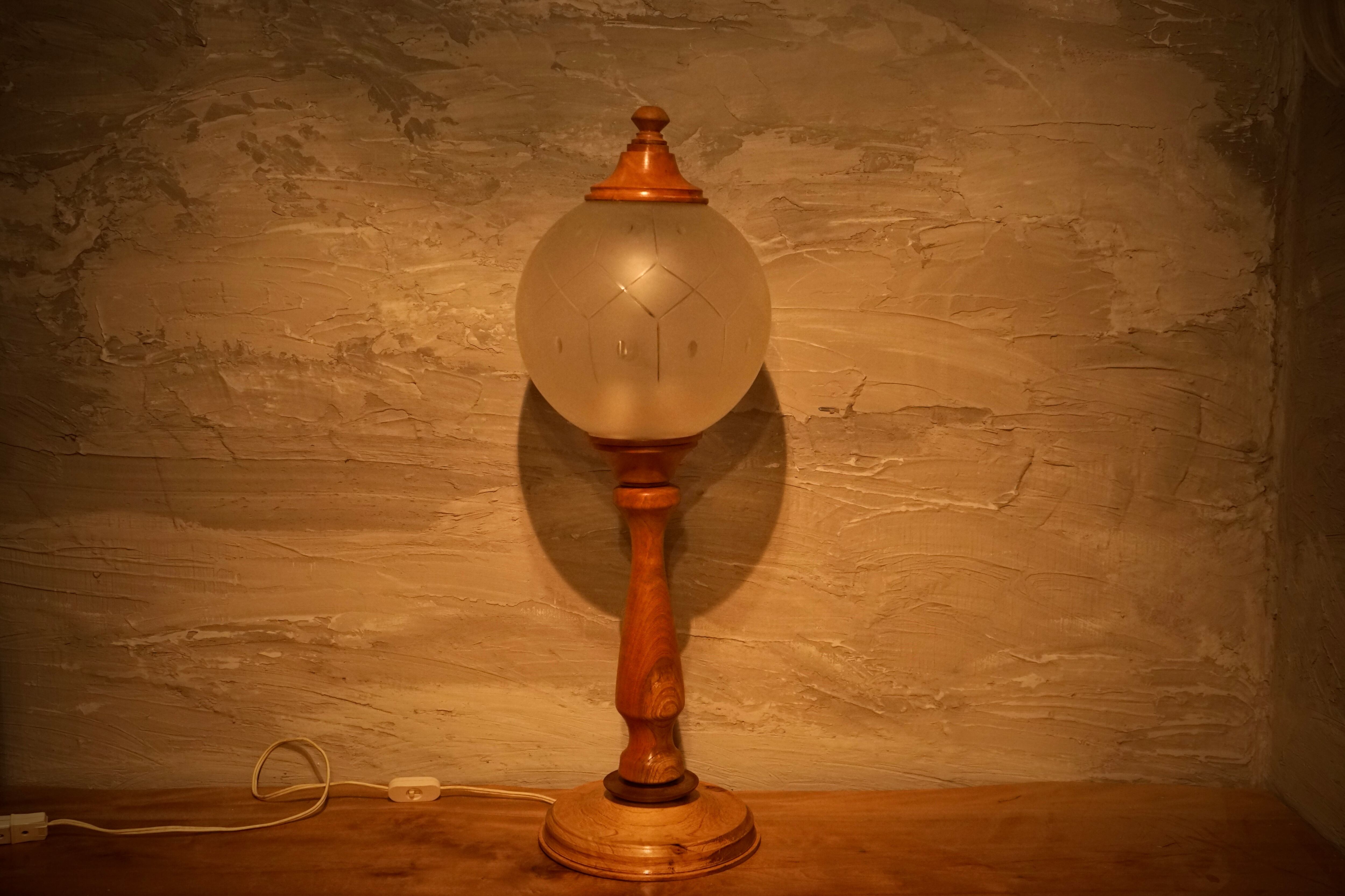 カエデの原木を台座に飾りにウォールナット、ガラス部分にはイタリア産のヴィンテージガラスを使用したスタンドランプ/テーブルランプです。