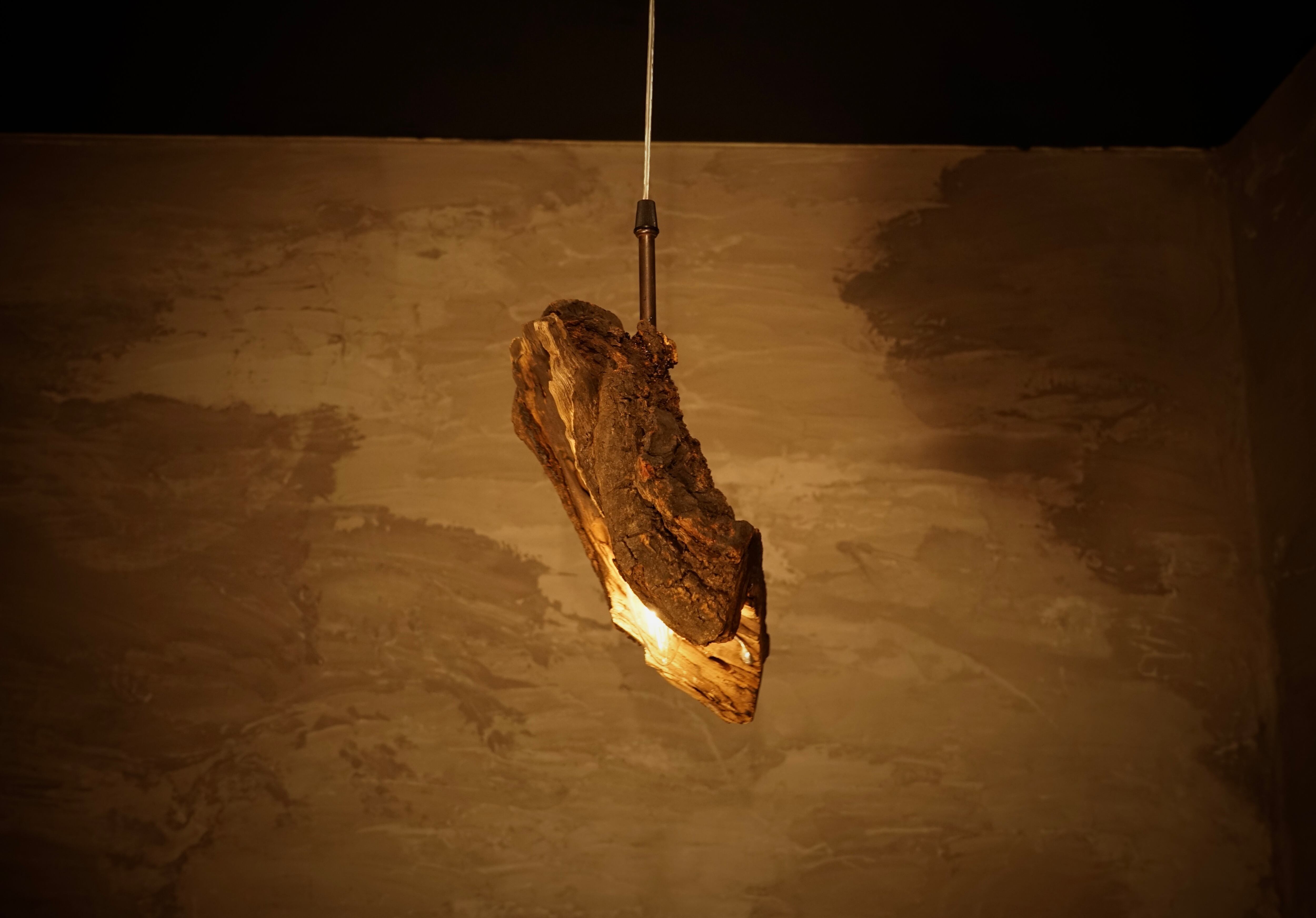 桜の原木の樹皮と金属を使用したペンダントランプになります。