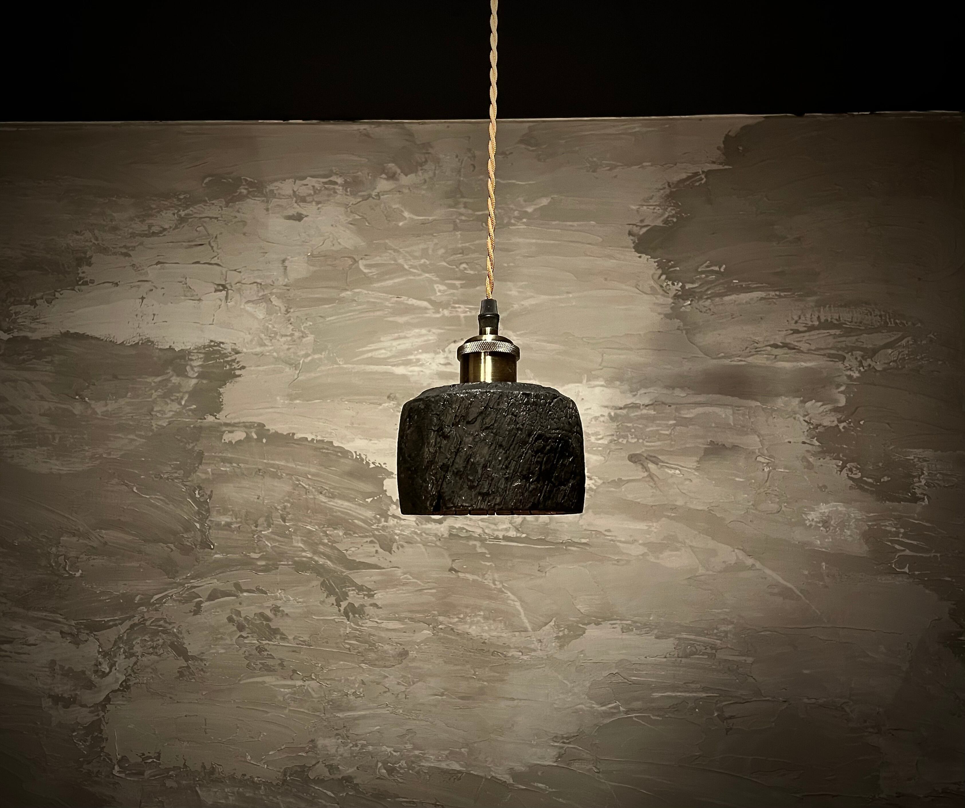 木材の欠けや節など木材の個性を残しつつ、一度木材を形成したあと炭化させ強く真の有る部分を残し加工を行いペンダントランプを作成いたしました。