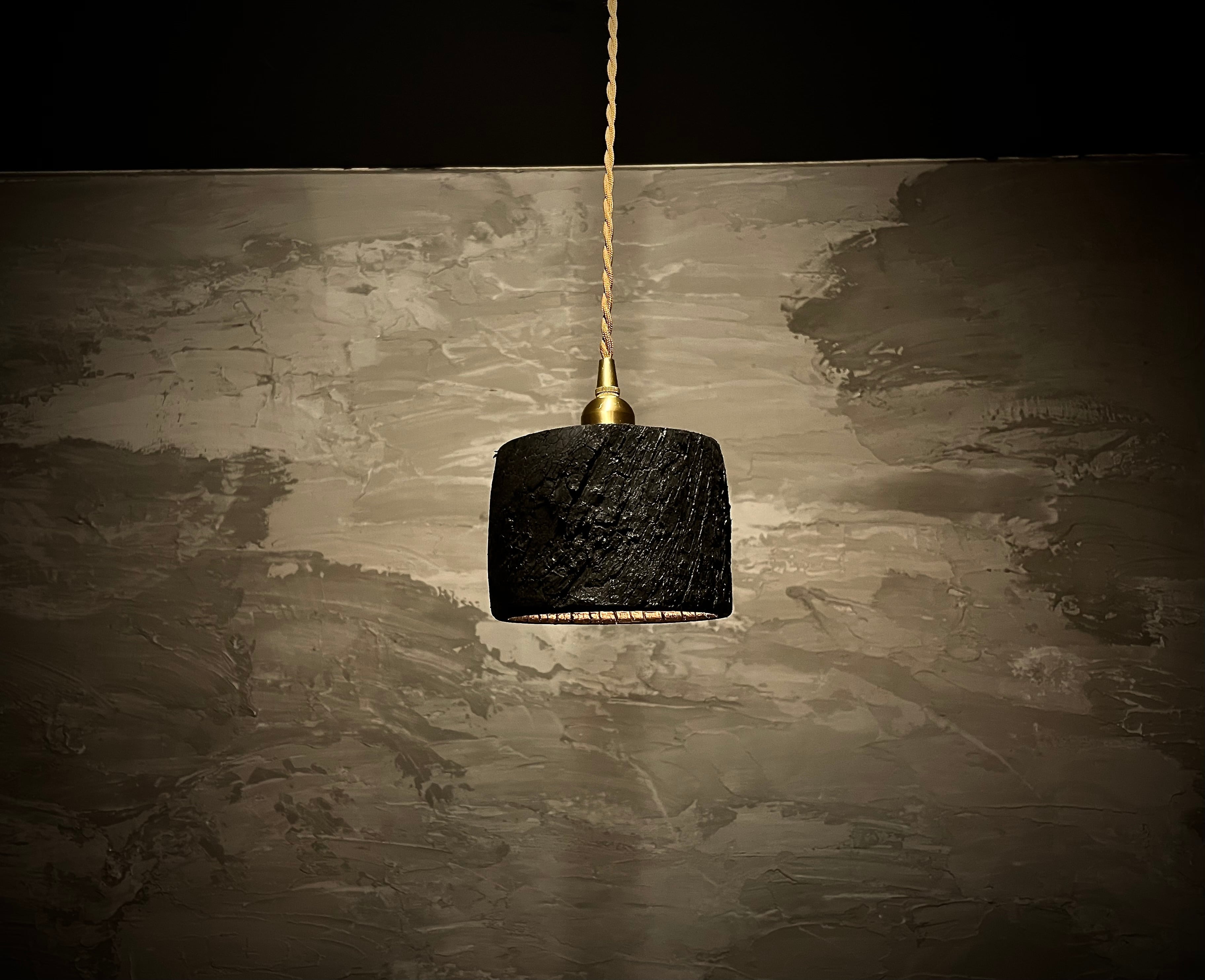 木材の欠けや節など木材の個性を残しつつ、一度木材を形成したあと炭化させ強く真の有る部分を残し加工を行いペンダントランプを作成いたしました。