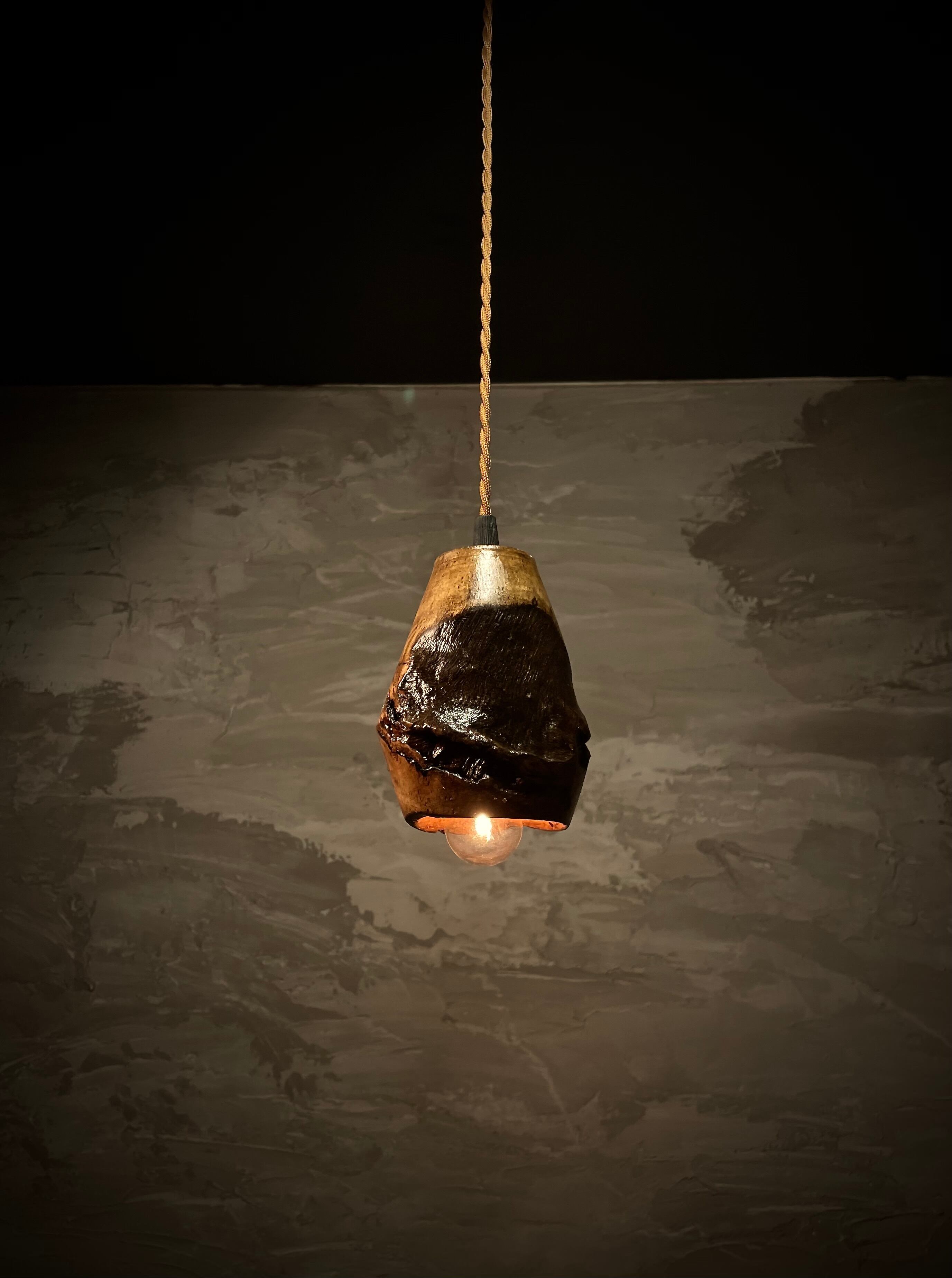 黒柿の原木を削りあげて漆で仕上げた「暁闇(ぎょうあん)」というペンダントライト。自然の美しさと独特な風合いが魅力です。光のあたり方によって、木目の模様や木の年輪が浮かび上がり、部屋に温かみを与えてくれます。シンプルでありながらも存在感のあるデザインなので、さまざまなインテリアにマッチします。
