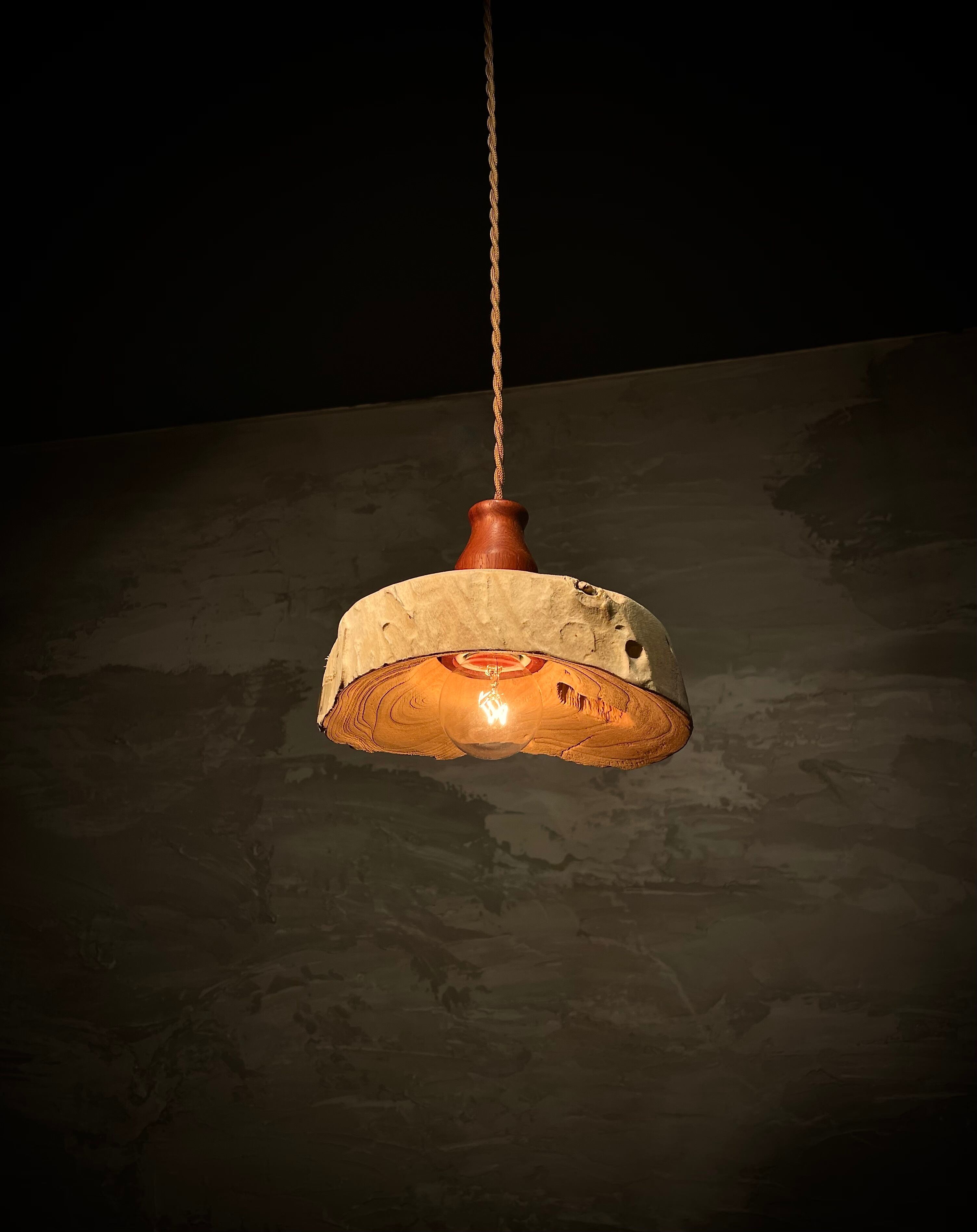 シェード部分には国産の桑の木を使用し、ソケットカバーには上質なニュージニアローズウッドを使用したpendant lamp-雀色時(すずめいろどき)は、木の温もりと美しい色合いが魅力的なペンダントライトです。