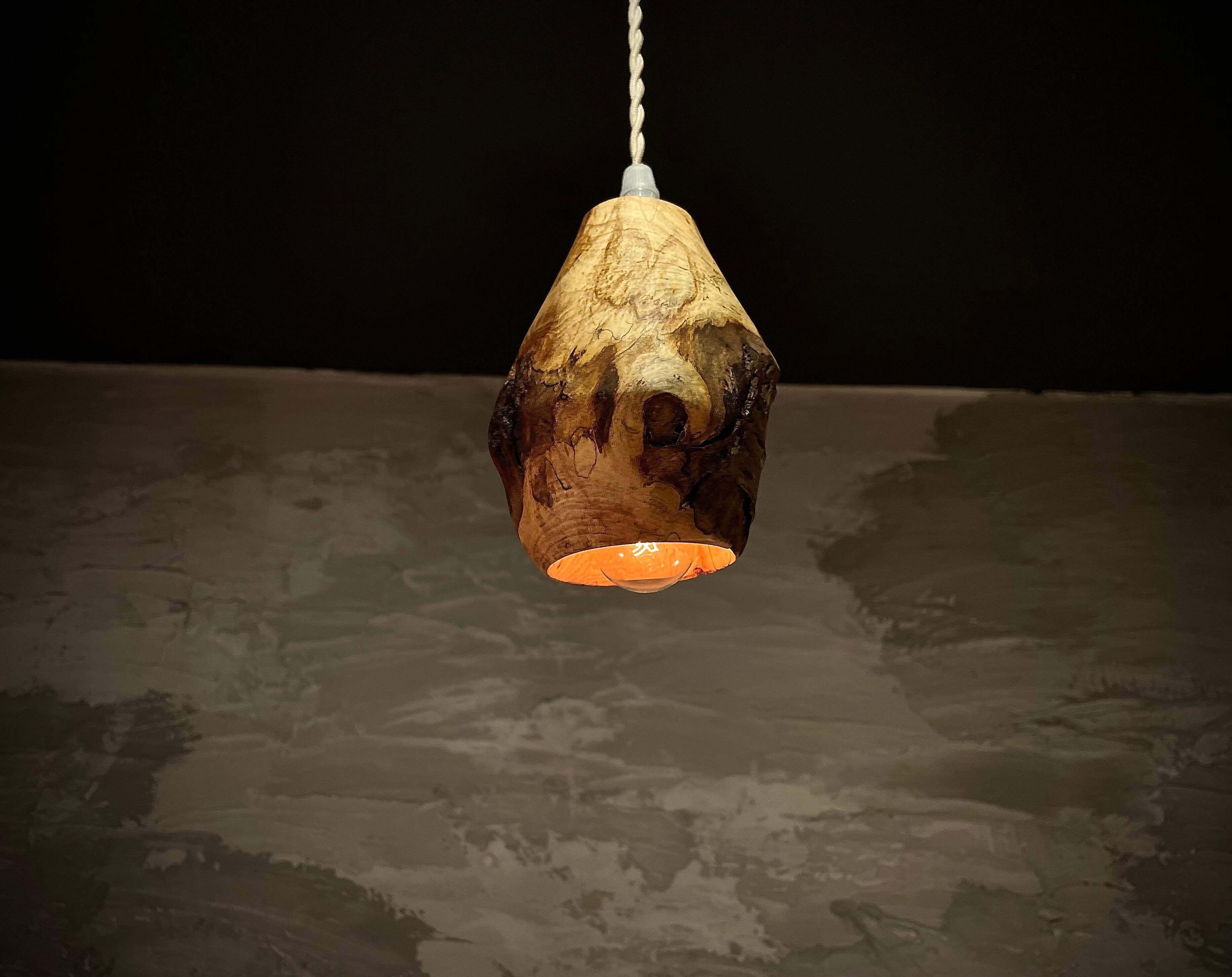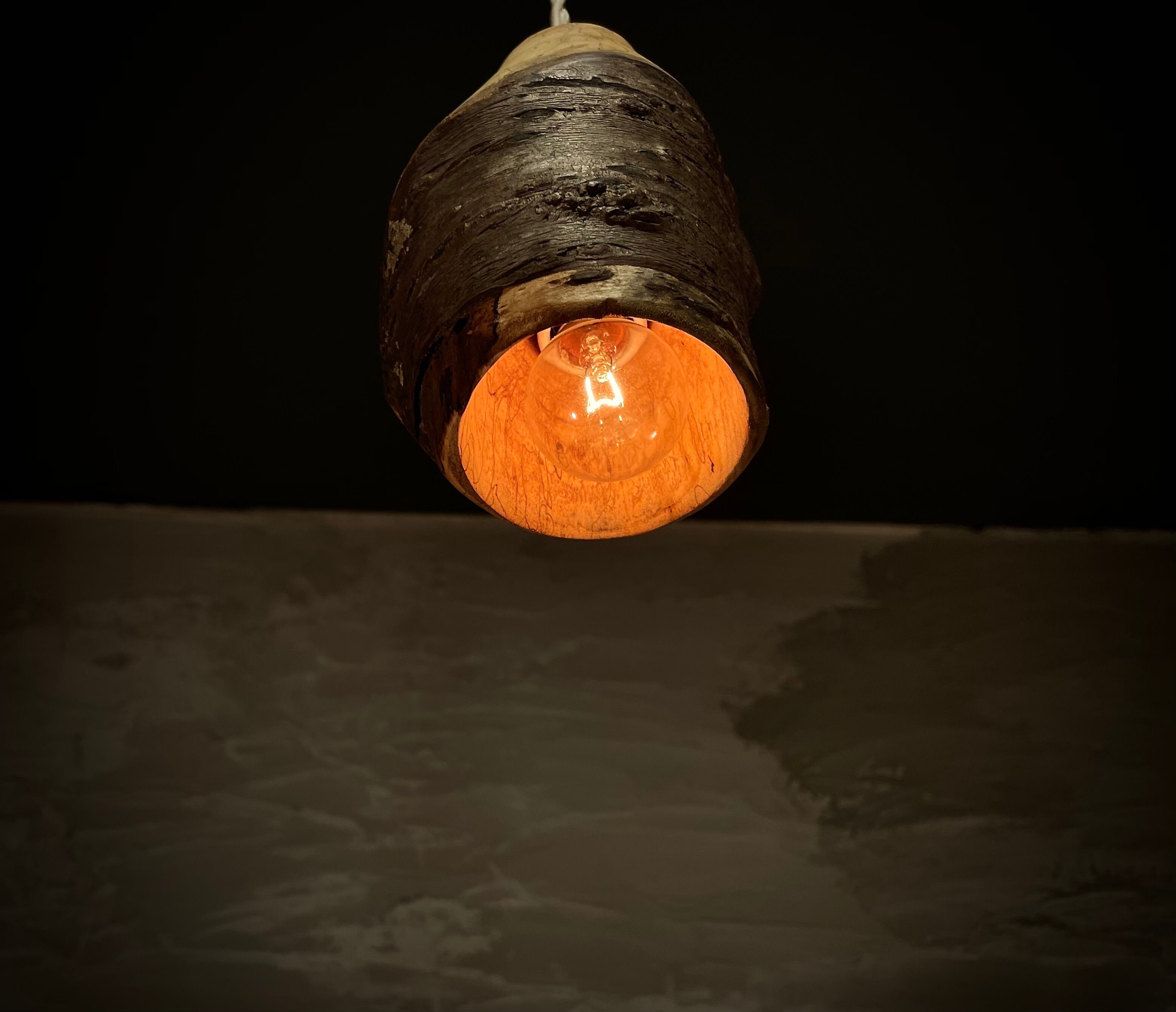 沈んだ赤朽葉の色合いが美しいpendant lamp-赤朽葉(あかくちば)。枝垂れ桜の原木を使用して作られた独自のデザインは、どんなインテリアとも調和します。暖かい光とともに落ち着いた雰囲気を演出します。