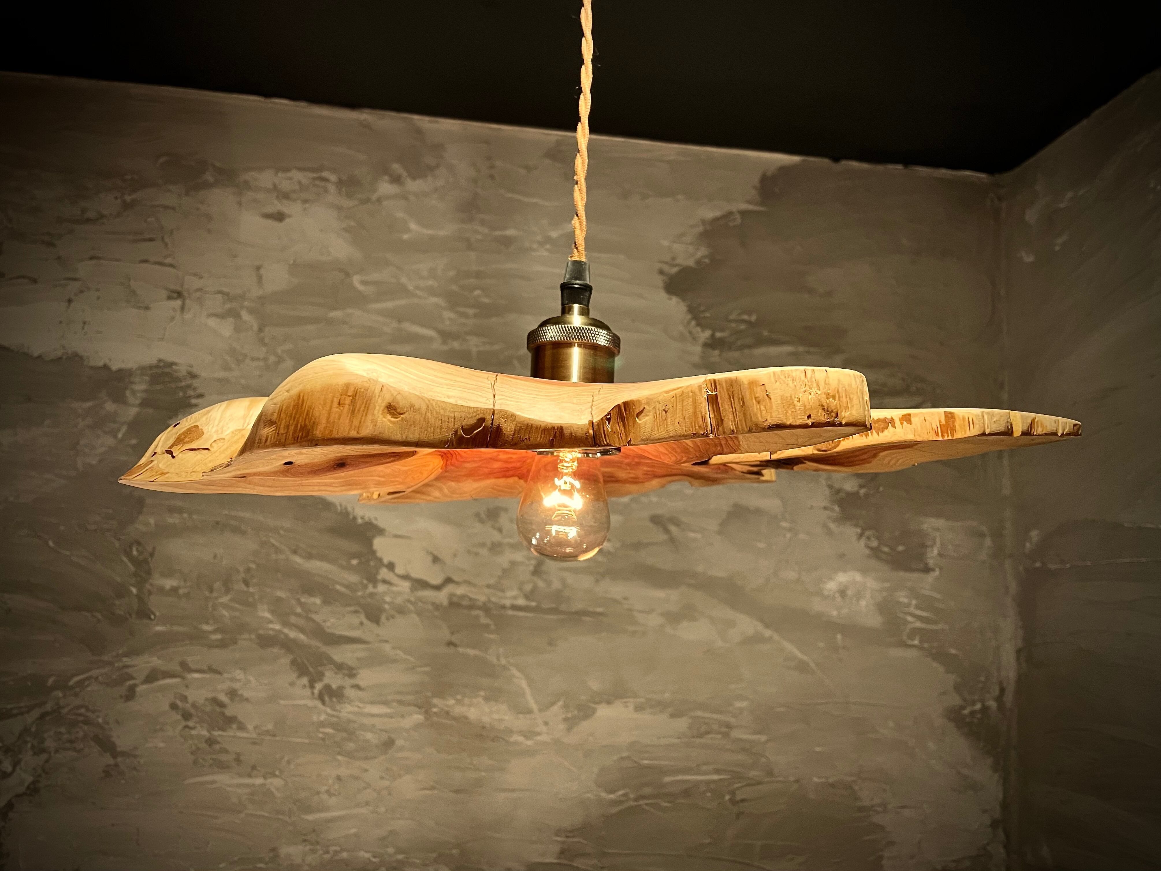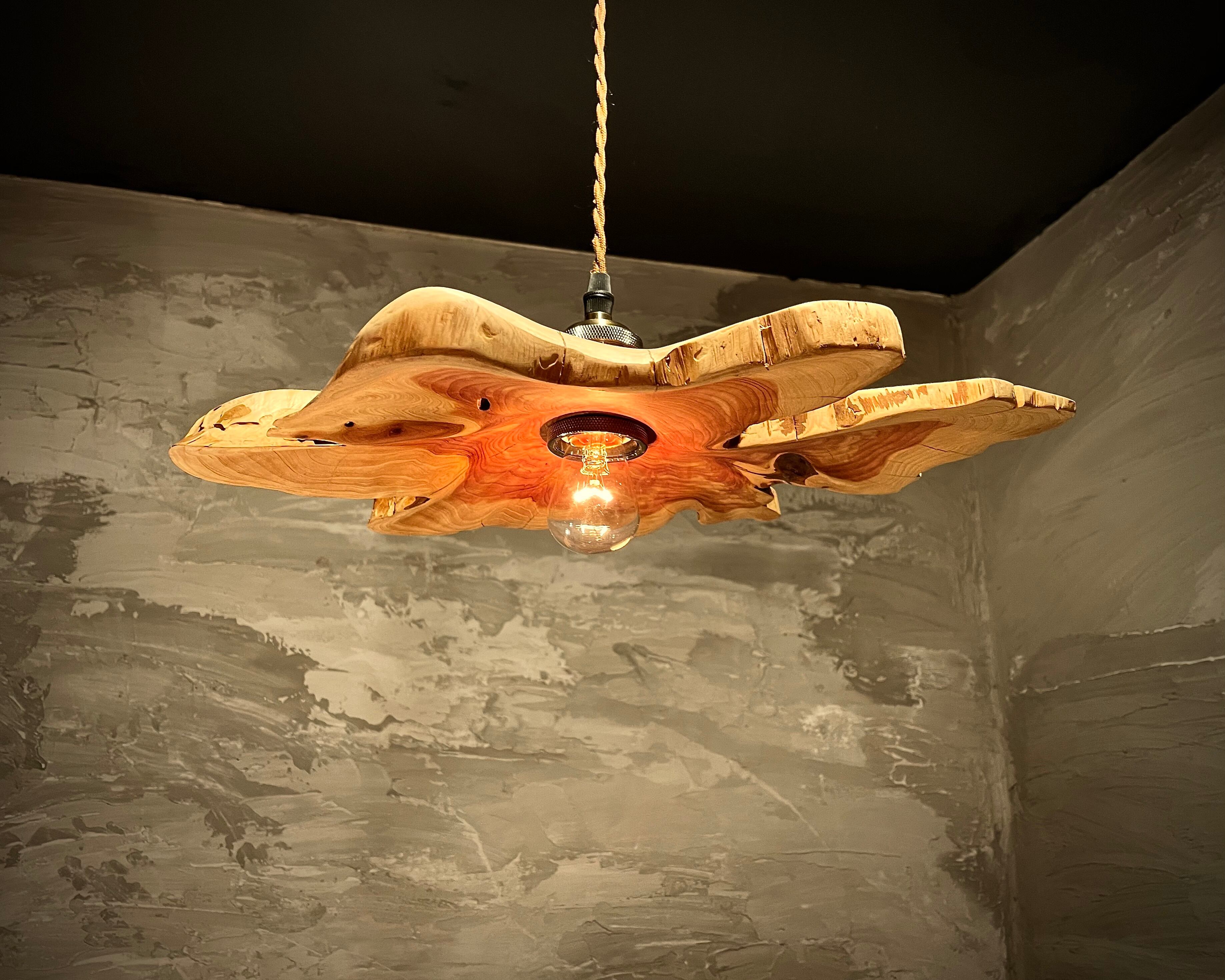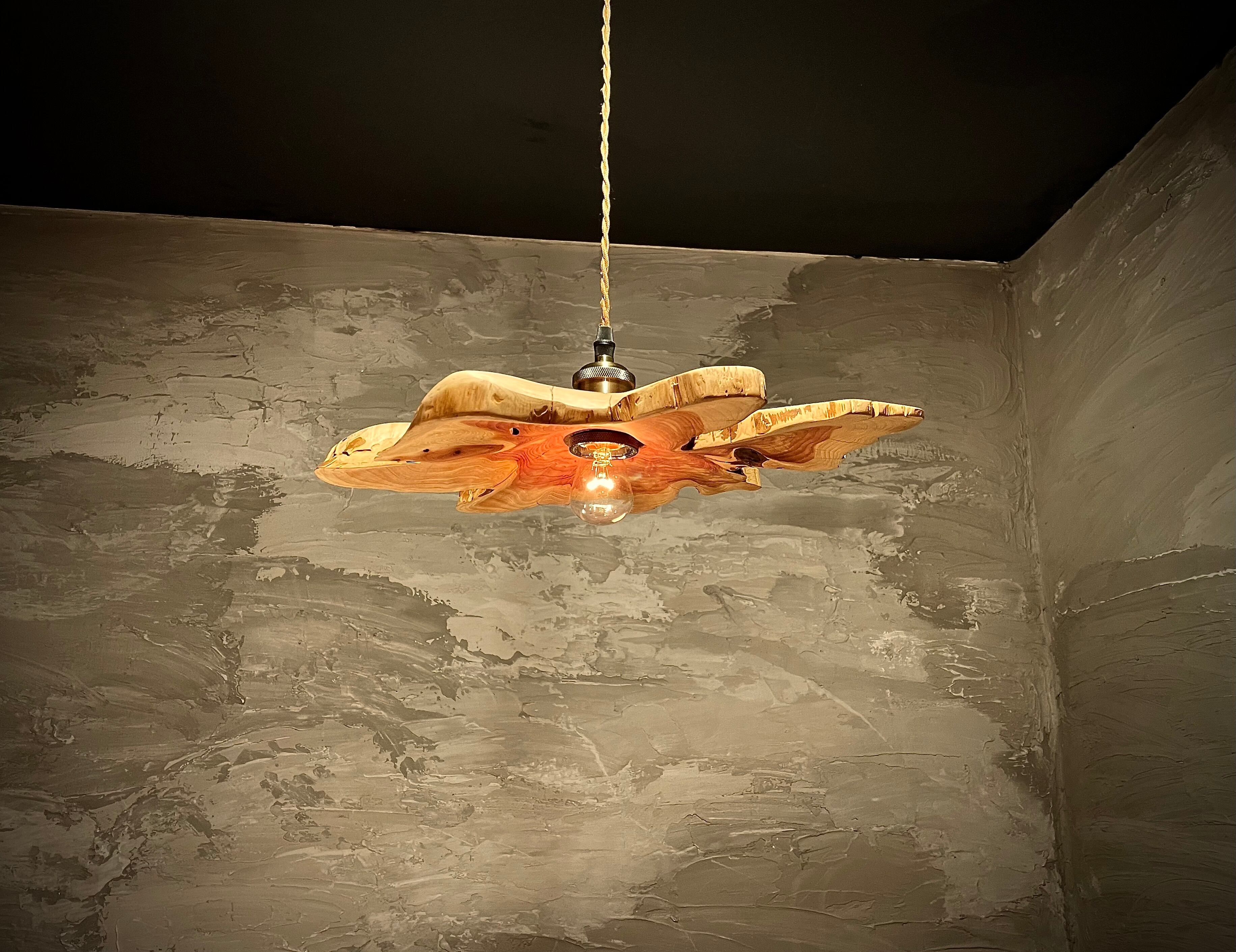 自然の素材を使ったpendant lamp-不言色(いわぬいろ)。イヌマキの原木を使用し、個性的なデザインが魅力です。木の質感や風合いを活かした照明は、空間に温かみを与えます。シンプルながらも存在感があり、お部屋のインテリアにアクセントを加えることができます。