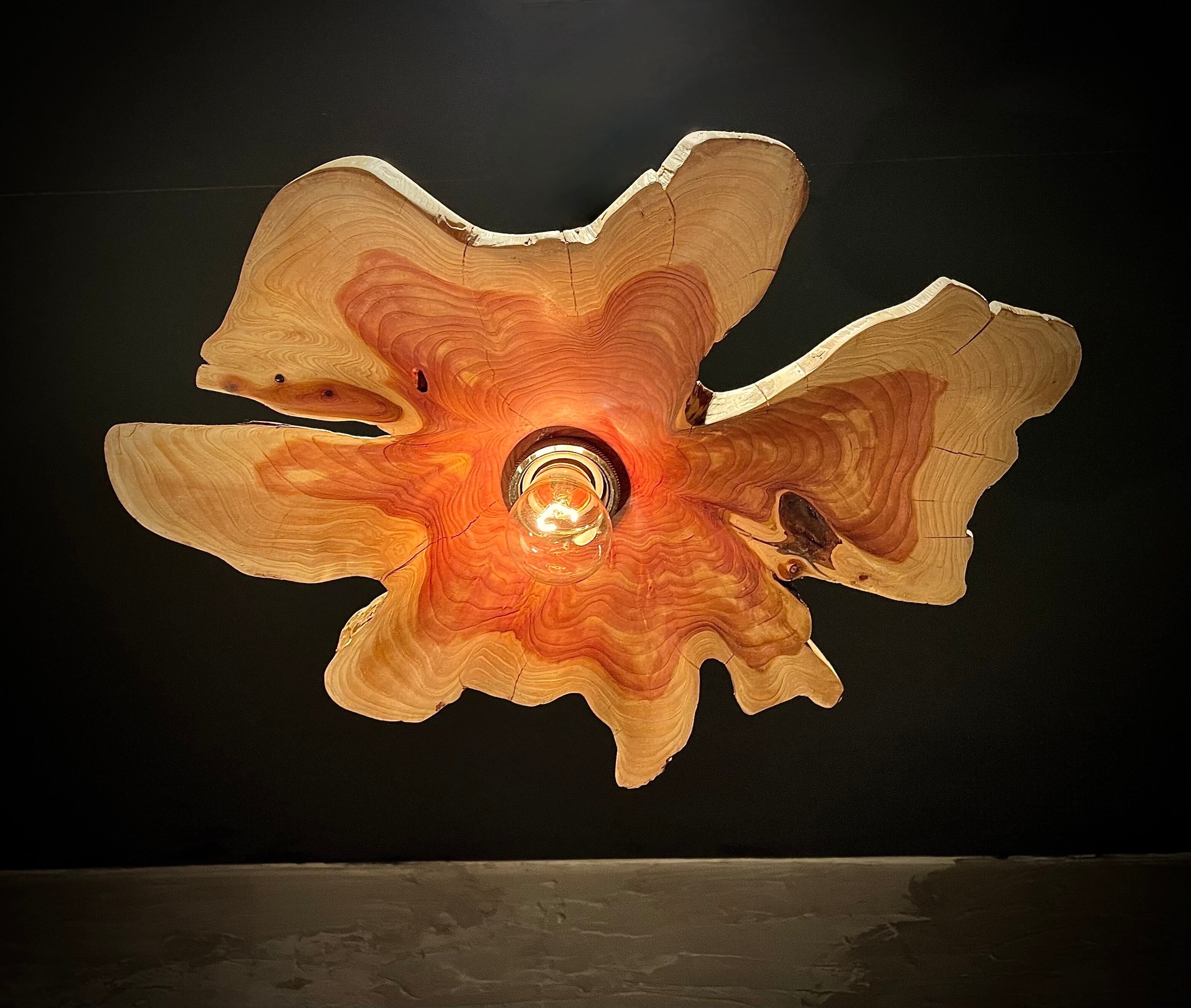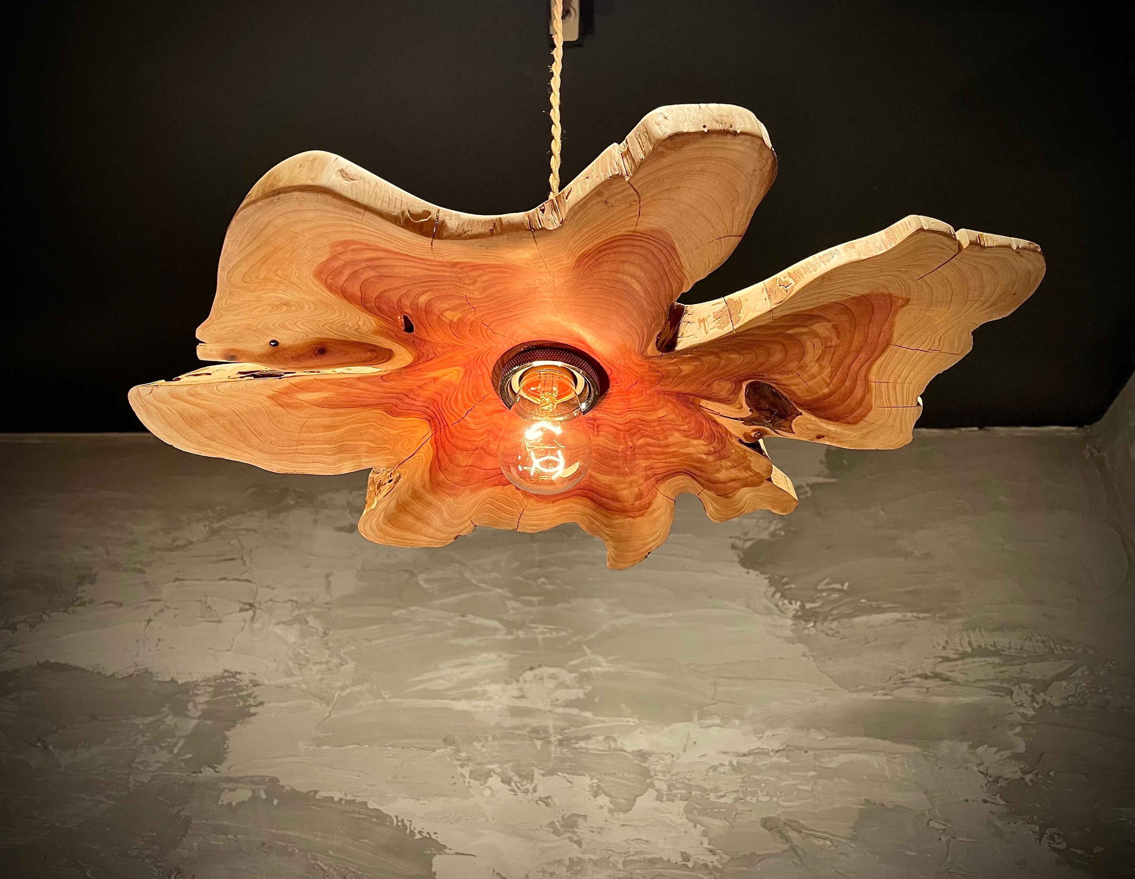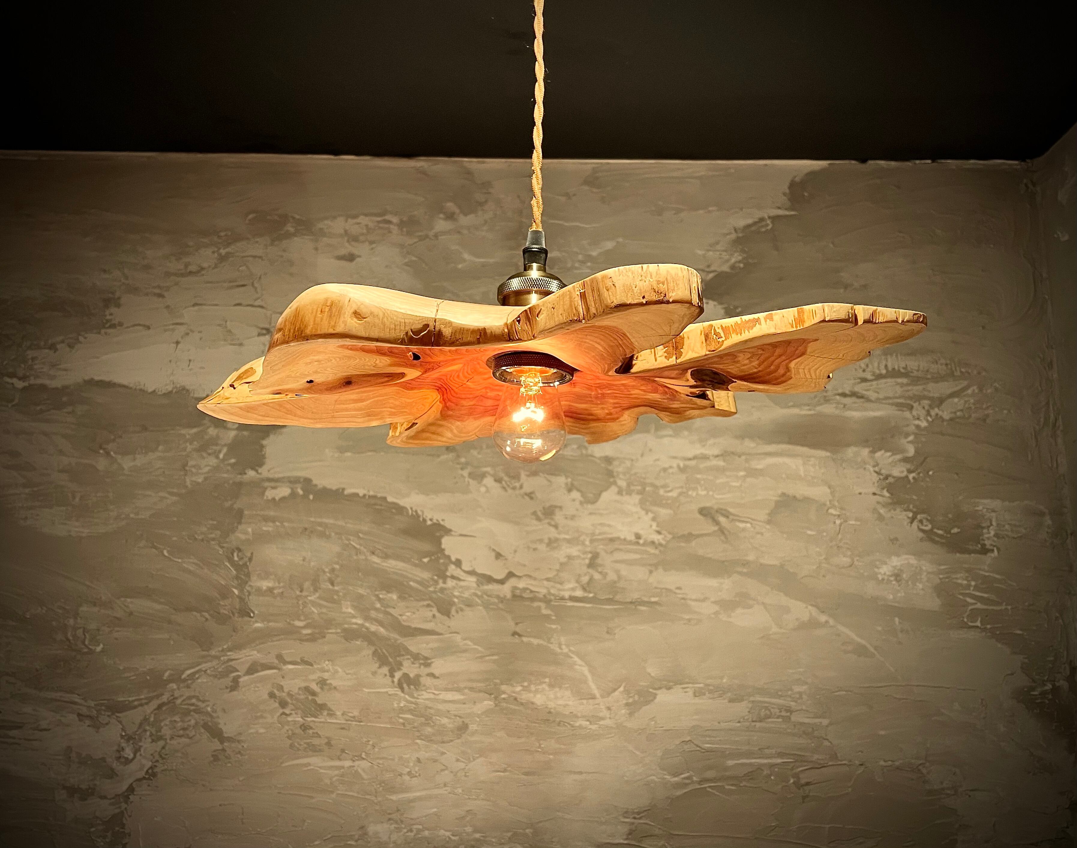 自然の素材を使ったpendant lamp-不言色(いわぬいろ)。イヌマキの原木を使用し、個性的なデザインが魅力です。木の質感や風合いを活かした照明は、空間に温かみを与えます。シンプルながらも存在感があり、お部屋のインテリアにアクセントを加えることができます。