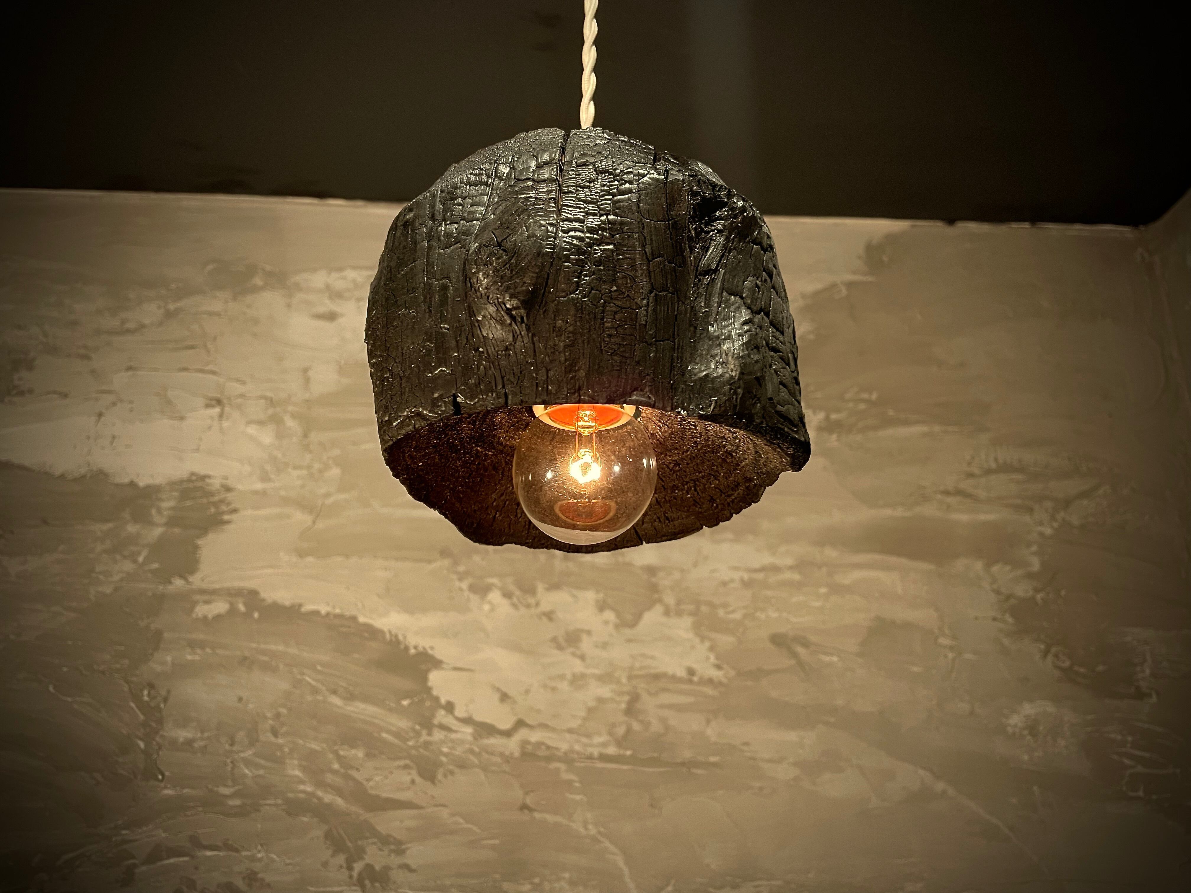 炭でできたペンダントライト。暖かみのある光と、炭の素材感が特徴です。その美しさは、一つ一つ手作業で丁寧に作り上げたからこそ生まれるもの。炭の表面には、独特の風合いや柔らかな木の香りを感じることができます。 その炭のペンダントライトを点灯させると、周囲が優しい光に包まれます。心地よいルームデザインや、リラックスした雰囲気を演出するのにぴったりのアイテムです。また、柔らかな光は、目にやさしく、疲れた心を癒す効果も期待できます。 見た目だけでなく、使用する炭にもこだわりました。天然のものを使用しているため、独自のパターンや表情が楽しめます。そのため、一つとして同じものはありません。炭の魅力を感じながら、日々の生活をより豊かに彩ってください。