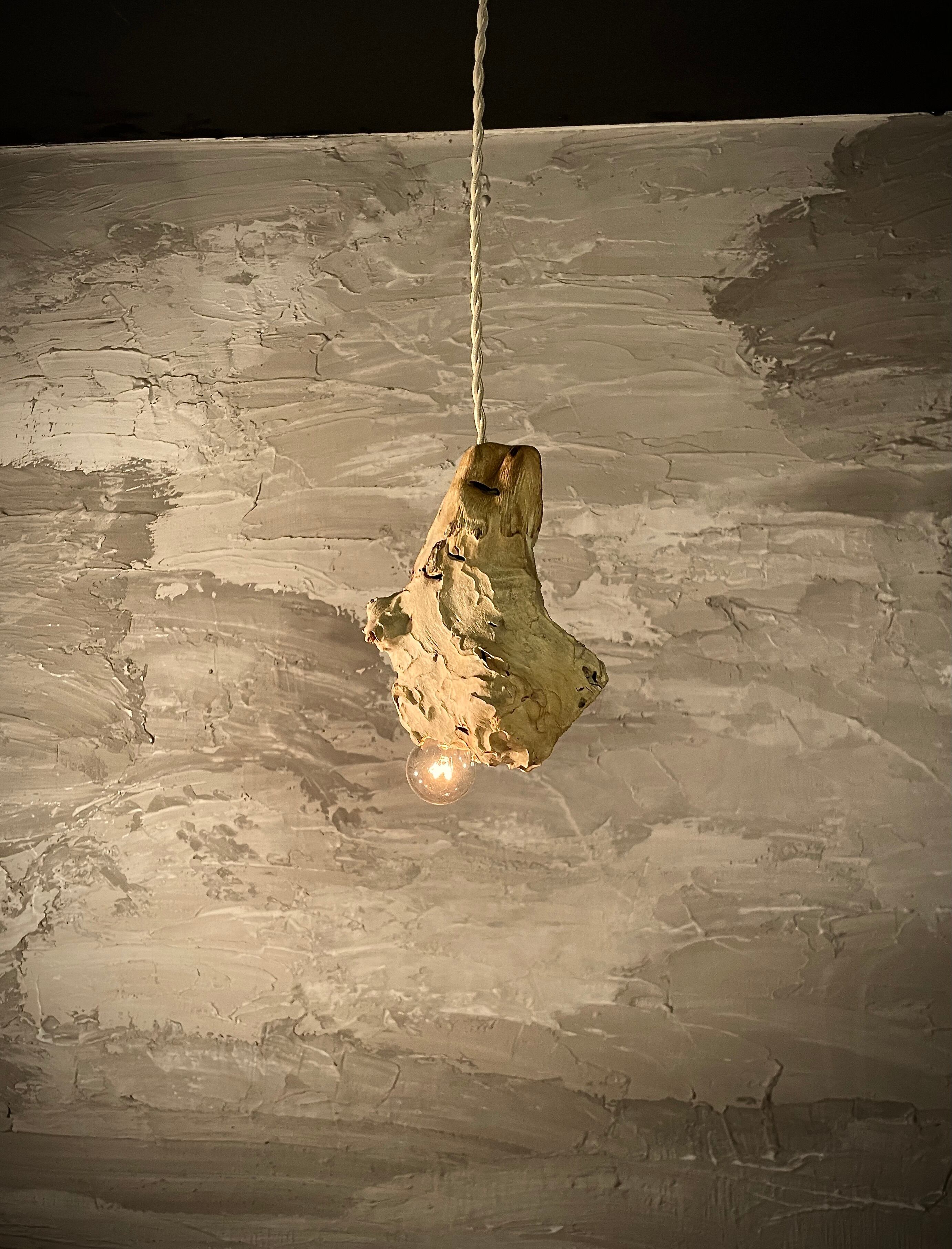 有機的な質感が魅力の「pendant lamp-蛾眉(がび)」。黒柿を使用した独特のデザインが、お部屋のアクセントとなります。自然の素材を生かした温かみのある光が、空間に居心地の良さを演出してくれます。